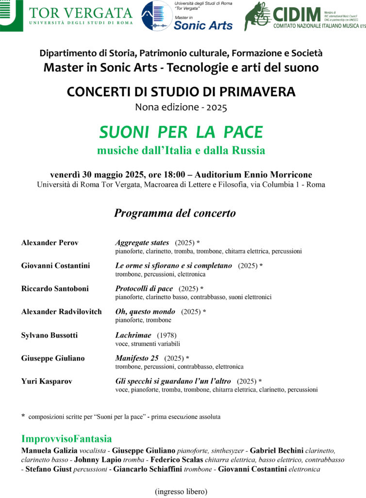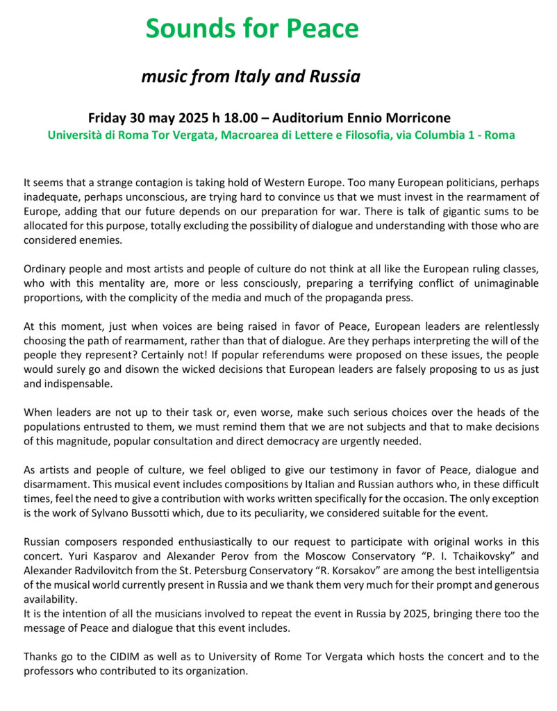 31 мая 2025 года в Риме, в Университете Тор Вергата (Auditorium Ennio Morricone), состоялось знаковое культурное событие — концерт «Suoni per la Pace» («Звуки мира»), который стал не только манифестом за мир и диалог, но и мощной акцией в защиту российской музыкальной культуры на международной арене.